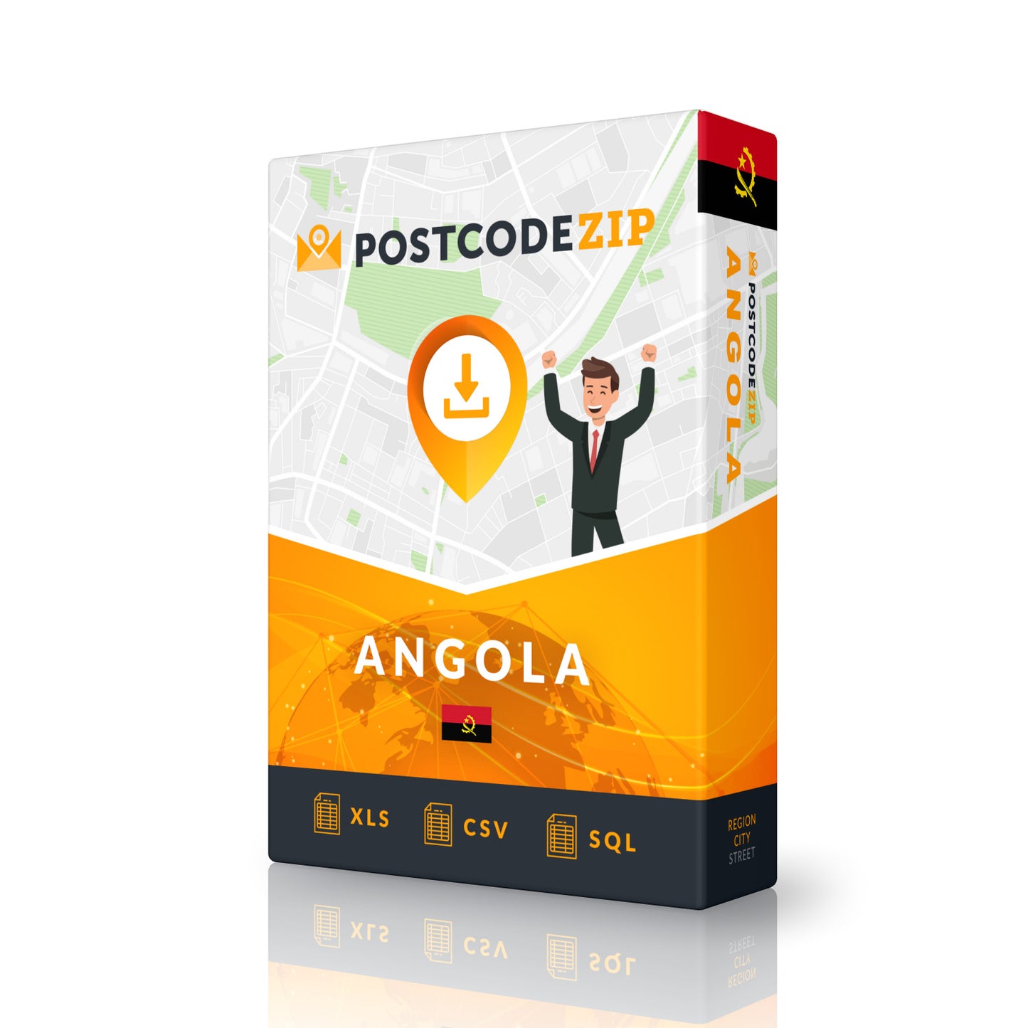 This product is a file that is emailed in Excel and CSV format. The location file is in spreadsheet format and includes 0 postal codes, 0 cities in Angola. A list of localities such as postal codes, cities, towns and villages for this country are included in the file. Easy to use and integrate, the locality file is compatible with many applications.