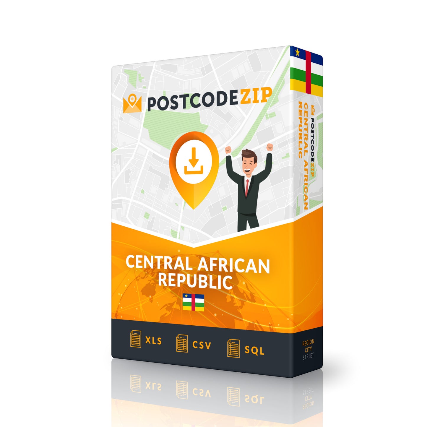 This product is a file that is emailed in Excel and CSV format. The location file is in spreadsheet format and includes 0 postal codes, 0 cities in Central African Republic. A list of localities such as postal codes, cities, towns and villages for this country are included in the file. Easy to use and integrate, the locality file is compatible with many applications.